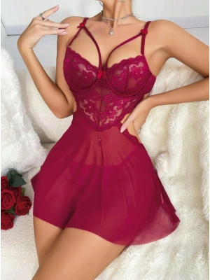 Kadın Kırmızı Fantezi Gecelik Tül Göğüs Dantel Dekolteli 2192