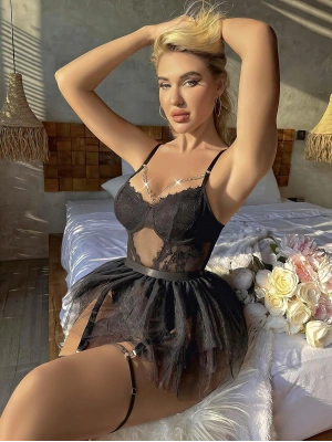 Kadın Siyah Fantezi Gecelik Kısa Tül Göğüs Dantel Dekolteli 2196