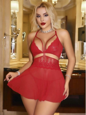 Kadın Kırmızı Fantezi Gecelik Kısa Tül Göğüs Fiyok Detaylı 2097