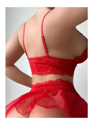 Kadın Kırmızı Transparan Kurdela Detaylı Arkası Çapraz Fantezi Kostüm 2249